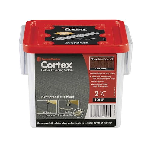 O FastenMaster Collated Cortex para decks Trex - 100 pés lineares é uma maneira rápida e fácil de ocultar fixadores e cabeças de parafusos ao instalar placas de convés Trex e agora é 50% mais rápido. Os plugues FastenMaster Cortex agora estão disponíveis em uma faixa agrupada. Isso minimiza o manuseio e economiza um tempo valioso no local de trabalho. O fixador não apenas fornece altos níveis de força de retenção, mas oculta os fixadores de todo o deck, incluindo a primeira e a última tábuas, placas de disjuntor, perímetro e escadas. Com o sistema de acionamento TORX ttap, é quase impossível removê-lo e os fixadores são facilmente removidos. O botão de estabilidade mantém o fixador em linha reta durante o processo de instalação. A ferramenta de configuração é de nível industrial e permite que você instale 350 fixadores em uma ferramenta de configuração Cortex. O Cortex é fácil de usar e inclui tudo o que é necessário, incluindo parafusos, plugues e ferramentas de configuração. A FastenMaster recomenda a instalação com uma furadeira sem fio de 18 volts. Os acionadores de impacto não são recomendados em tábuas de convés feitas de material compósito com ou sem cabeçote. Nota: A pré-perfuração não é necessária durante a maior parte do projeto. A pré-perfuração é necessária ao fixar a menos de 1/2" da extremidade de uma placa e nas juntas esquadradas. Use uma broca de 3/16" para furos piloto pré-perfurados.