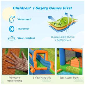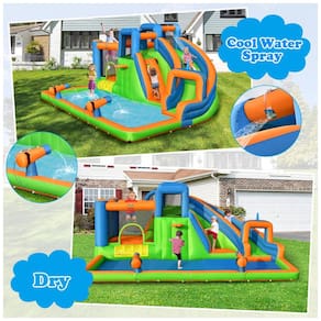 O combo de casa inflável com toboágua infantil BOUNTECH é o presente perfeito para estimular o potencial das crianças e proporcionar uma infância feliz. Com diferentes comprimentos e inclinações nos slides, as crianças podem dominar seu próprio equilíbrio e velocidade e exercitar sua capacidade de coordenação física. Além disso, a casa inflável de salto de água combina uma variedade de funções e entretenimento em um, incluindo um longo escorregador, parede dupla de escalada, piscina infantil e área de salto. Feito de material durável à prova d água, resistente a rasgos e com costura de reforço duplo, o castelo saltitante pode acomodar várias crianças para brincarem juntas com segurança. A área de salto é cercada por uma parede de malha respirável de 4 lados e as grades de proteção elevadas dos escorregadores aumentam ainda mais a segurança. O parque aquático do quintal foi projetado com canhões de água e um aspersor superior, que fornecem spray de água fria constantemente para deixar as crianças imersas em brincadeiras ao ar livre. O pacote com tudo incluído vem com uma bolsa de transporte conveniente, estacas de segurança, remendos de reparo, kit de montagem de mangueira de água, bola de basquete inflável e bomba manual para a bola. Recomendado para uso com soprador 735W750W não incluído .