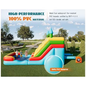 O Albott Commercial Bounce House with Slide & Water Pool é feito 100% de PVC, material pesado e resistente, adequado para uso comercial e recreação ao ar livre. O PVC proporciona durabilidade, resistência a rasgos e impermeabilidade, sendo ideal para suportar o uso intenso por crianças e adultos em ambientes externos.