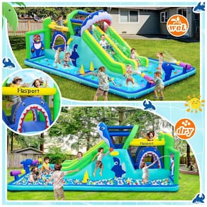 Apresentamos a Casa Inflável com Tobogã e Parque Aquático da FBSPORT, perfeita para o verão, festas de aniversário, festivais e feriados. Com uma ampla piscina onde as crianças podem brincar e ter batalhas de água, a diversão é garantida. Este parque aquático inflável inclui tudo que você precisa: um inflável com duplo tobogã, parede de escalada, área de pulo, arremesso de argolas, cesta de basquete, splash e muito mais. Fabricado com material PVC espesso e seguro, possui costuras duplas para maior durabilidade e segurança. Além de afastar as crianças dos eletrônicos, incentiva o desenvolvimento de habilidades motoras, socialização e brincadeiras criativas. Com áreas de jogo diversificadas, como jogo alvo, pistolas d'água, parede de escalada, tobogã duplo e muito mais, este parque aquático é garantia de entretenimento sem fim. Aproveite a diversão ao ar livre com segurança e praticidade. Aproveite agora!
