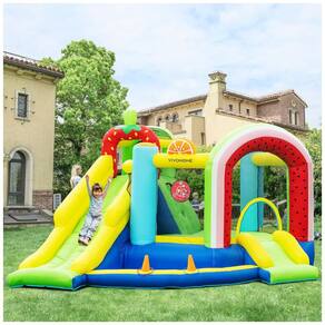 O VIVOHOME 7 in 1 Bounce House para crianças, com tema Fruit, é feito de materiais duráveis e seguros, especificamente tecido Oxford 420D resistente a perfurações e tecido PVC 840D. Esses materiais são de alta qualidade, reforçados com costuras para garantir longa durabilidade e resistência ao desgaste. Além disso, o produto possui paredes de malha para ventilação e visibilidade, promovendo segurança durante o uso. Os materiais são ecológicos e seguros para crianças, adequados para uso prolongado em ambientes externos.