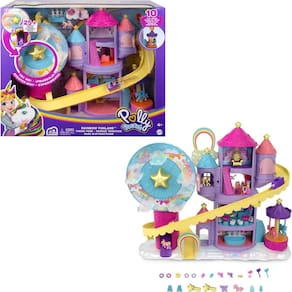 - Prepare-se para a diversão no parque temático com o parque temático Rainbow Funland com 3 passeios, 7 áreas de jogo, bonecas Polly e Shani, 2 unicórnios e 25 surpresas (30 peças no total).