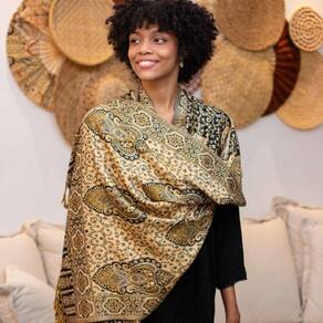 Pashmina Estampada 100% Viscose Preto 70cmx200cm Pashmina Estampada 100% Viscose Preto 70cmx200cm A Pashmina é um tipo de fio muito utilizado para produzir lindas peças como echarpes e lenços na cultura indiana. Possuem toque macio e são utilizadas para se proteger do frio e para compor looks mais sofisticados para uma ocasião especial. É um excelente item para se ter na bolsa em dias mais frios e também presentear alguém especial. Material: 100% ViscoseCor Predominante: PretoLargura: 70cmComprimento: 200cmPeso: Aproximadamente 270grOrigem: índia O produto é artesanal, fabricado e importado da Índia e por isso torna-se quase único apresentando pequenas variações. Os produtos podem apresentar pequenas variações de cor, tonalidade e brilho: produto artesanal. Podem ter pequenas variações em seu tamanho: produto artesanal. Podem ter pequenas variações em seu peso: produto artesanal. Produtos frágeis: CUIDADO ao lavar, pois são artesanais e com tecido sensível à lavagens pesadas. Marca: Balisun