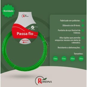 Passa Fio Helicoidal Linha Pesada 30 Metros Passa Fio Helicoidal Linha Pesada 30 Metros - ROHDINA Os passadores de fio são indispensáveis para todo instalador, pois facilitam a passagem dos cabos dentro da tubulação. Por isso, é primordial que seja um produto de qualidade, resistente e que não te deixe na mão! Disponíveis nos comprimentos de 10m, 15m, 20m e 30m, além dos seguintes diferenciais: