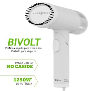 Potência de 1250W com jato de vapor contínuo 19g/min de emissão de vapor Tempo de aquecimento: 45 segundos Reservatório de água: 150ml Autonomia de uso: até 13 minutos 7 furos de saída de vapor Temperatura máxima: 154°C Luz indicadora de funcionamento Bivolt manual: ideal para viagens Copo dosador de 100ml incluso Acompanha escova para pelos e sujeiras Portátil, leve e fácil de usar.