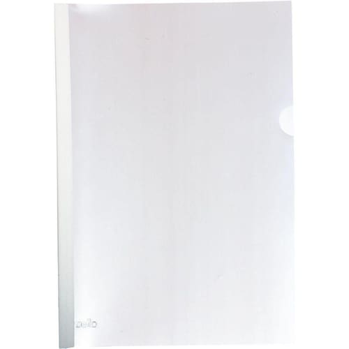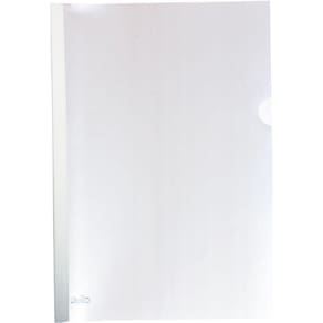 Material: Pasta em polipropileno resistente com canaleta e lombada triangular. Possui vinco lateral onde proporciona o encaixe perfeito da canaleta e permite com que ela não escorregue no momento da fixação das folhas. Cor: Cristal. Dimensões: 307 x 220mm. Quantidade: Pacote com 10 unidades.