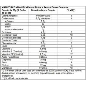 Mani Force Integral é uma fonte natural de aminoácidos essenciais,fundamentais na síntese proteica e formação muscular.Ela é ideal para atletas que buscam energia e um complemento proteico de qualidade na sua alimentação, com uma otina textura e um ótimo sabor Ingredientes: Pasta integral de amendoim torrado. Não contém Glúten, zero lactose, sem conservantes. SUGESTÃO De Consumo E Preparo: Consumir 01 colher de sopa (aproximadamente 15 gramas) de pasta de amendoim integral ao dia ou conforme orientação de nutricionista ou médico. BENEFÍCIOS: Sem adição de açúcar; 4.7g de proteína por porção; Zero Gordura trans; 100% Produto natural; Registro isento conforme resolução rdc 27 de 06 de agosto de 2010 anexo i.