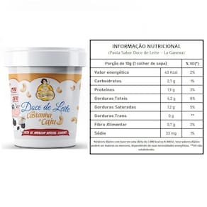 Pasta de amendoim sabor doce de leite - la ganexa 1kg Descrição:Imagina só aproveitar todos os nutrientes do amendoim em uma pasta artesanal com seu sabor preferido Parece um sonho, mas a la ganexa veio como uma fada madrinha para realizar O amendoim possui antioxidantes, concentra gorduras saudáveis e ainda fortalece os músculos. Pode ser consumida todos os dias, mesmo que não haja treinos. As pastas la ganexa são perfeitas para dietas restritivas ou para quem quer comer algo saboroso sem peso na consciência. Seu diferencial está em sua textura, sabor e consistência. O consumo de pasta de amendoim fornece gorduras de boa qualidade, proteínas e baixa quantidade de carboidratos. Diferenciais:- sem glúten;- sem açúcar;- excelente fonte de gordura boa. Ingredientes - sabor doce de leite com castanha:Pasta de amendoim, castanha de caju, doce de leite em pó zero açúcar, chocolate ao leite zero açúcar, maltitol, leite em pó desnatado, óleo de coco, aroma idêntico ao natural de doce de leite, sal rosa, sucralose pura, amor . Não contém glúten. Alérgicos: contém amendoim, castanha de cajú e derivados do leite. Sugestão de consumo:A pasta de amendoim la ganexa pode ser consumida em qualquer hora do dia, principalmente no café da manhã, nos lanches e aliada aos treinos. É deliciosa para comer pura e combina com frutas, panquecas, pães, torradas e biscoitos. Conservação:Este produto deve ser armazenado em local fresco, seco e arejado. Após aberto conservar em temperatura ambiente e consumir dentro do prazo de validade. Não necessita refrigeração. Pode haver uma separação natural do óleo de amendoim da pasta. Caso isso ocorra, misture para que ela volte a sua condição normal.