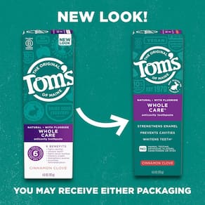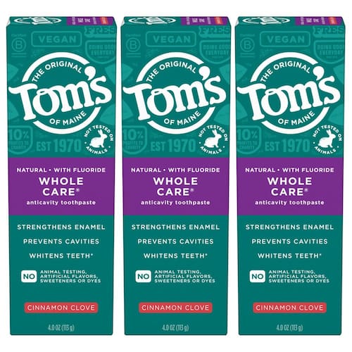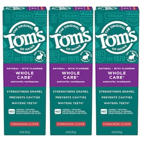 Tom's of Maine Pasta de dente natural Whole Care com flúor, cravo de canela, 118 g, pacote com 3 (a embalagem pode variar) - O que você receberá: três tubos de 118 g de pasta de dente natural Tom's of Maine Whole Care com sabor de cravo de canela - Uma pasta de dentes, seis benefícios: a pasta de dente com flúor combate as cáries, fortalece o esmalte e promove a remineralização - Cuidados com a boca inteira: também clareia os dentes, evita o acúmulo de tártaro e refresca o hálito - Tubo reciclável: procure a bandeira azul de reciclagem, esprema o máximo de pasta de dente que puder, substitua a tampa e recicle - CUIDADO DE SI MESMO NATURALMENTE: Não contém conservantes, cores ou sabores artificiais e não é testado em animais
