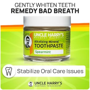 Este é um creme dental não tóxico, livre de conservantes, agentes espumantes sintéticos, abrasivos e glicerina. Os minerais iônicos nesta pasta de dente fornecem quantidades significativas de cálcio e magnésio para dentes saudáveis. - Hálito fresco – Uma pasta de dente totalmente natural que elimina o mau hálito com hortelã revigorante e refresca sua boca com argilas minerais, sal marinho e essências vegetais puras durante todo o dia. Os produtos de pasta de dente natural Uncle Harry's vêm embalados em um frasco de vidro ecológico e sem desperdício que foi etiquetado à mão. - Fortalece os dentes – Salve seus dentes e gengivas com uma fórmula de pasta de dente remineralizante. Estimula o esmalte dental mais saudável ao nutrir os dentes com cálcio, magnésio e fósforo. Também ajuda a manter um pH naturalmente alcalino que é melhor para a saúde bucal e higiene dental. - Branqueamento natural dos dentes – Livre-se das tiras de clareamento e evite o aumento da sensibilidade dos dentes. Nossa fórmula natural de clareamento de pasta de dente ajuda você a se sentir confiante de que está polir e aperfeiçoar seus dentes sem produtos químicos agressivos. - Ingredientes sustentáveis para pasta de dentes – A pasta de dente natural Uncle Harry's contém apenas ingredientes naturais e minimamente processados para sua família. Água purificada, argila bentonita, carbonato de cálcio, sal marinho, minerais iônicos alcalinizantes, semente de mostarda, mentol natural, óleos essenciais puros de hortelã, hortelã-pimenta, eucalipto, cravo, gaultéria e orégano. - Limpo e de qualidade – os remédios de higiene bucal Uncle Harry's são orgulhosamente livres de SLS, sem glúten, sem glicerina, sem flúor e veganos para atender até mesmo as necessidades dentárias mais sensíveis e conscientes. Nossos produtos de pasta de dente 100% natural também são feitos sem conservantes sintéticos, como agentes espumantes, cores, sabores artificiais ou bicarbonato de sódio.