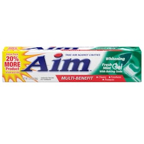 Aim Pasta de dente Tubo de 170 g (pacote com 6) Gel de menta fresca - Limpa e refresca: a pasta de dente em gel com bicarbonato de sódio ajuda a remover manchas superficiais, refresca o hálito e oferece uma sensação de limpeza profunda a cada uso. Deixa sua boca fresca e revigorada. - Proteção de cavidade: a fórmula de flúor fortalece o esmalte para ajudar a prevenir cáries e proteger contra cáries dentárias. Projetado para manter os dentes fortes, saudáveis e com a melhor aparência com a escovação regular. - Cuidados multibenefícios: Clareia os dentes enquanto fornece suporte completo à saúde bucal, protege o esmalte e ajuda a manter um sorriso brilhante. Desfrute de um sabor de menta fresca para uma experiência de escovação fresca e refrescante.
