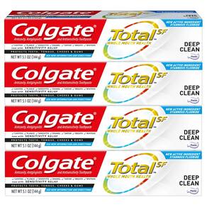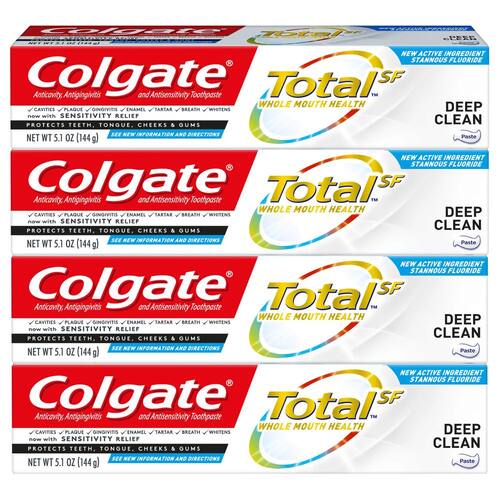 Colgate Pasta de dente total, limpeza profunda - 145 g (pacote com 4) - Combate bactérias nos dentes, língua, bochechas e gengivas para saúde da boca inteira - A fórmula estanosa de pasta de dente com flúor e zinco ajuda a proteger contra cáries, sensibilidade e gengivite, entre outros vários benefícios desta fórmula inovadora - A pasta de dente para remoção de manchas remove e evita que novas manchas clareem os dentes - Melhora a força do esmalte e neutraliza o odor - Ajuda a evitar o acúmulo de placa e controla o tártaro - Pacote de 4 tubos de pasta de dente com 1,5 g em cada; um total de 5,8 g