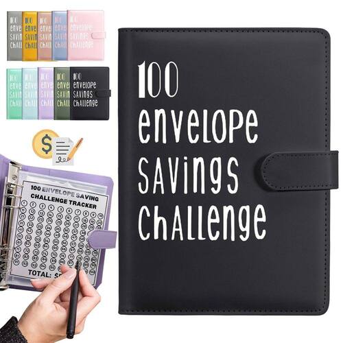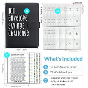 Você receberá: 1 fichário A5 de couro PU preto, 25 envelopes de dinheiro com 6 furos, 1 rastreador de folhas de $1 a $100. Quatro conjuntos de adesivos numéricos de desenhos animados rotulados de 1 a 100. Use nosso fichário de economia de dinheiro para desafios de 100 dias para gerenciar suas finanças de forma eficaz.