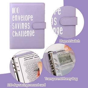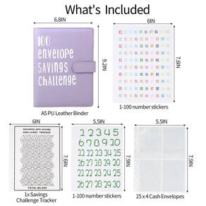 Kit de desafio de 100 envelopes: um fichário A5 com compartimento para cartões, carteira de dinheiro e anel de aço inoxidável, 25 envelopes de dinheiro transparentes reutilizáveis, adesivo numérico de 1 a 100 e rastreador. Uma grande variedade de acessórios disponíveis, um bom organizador de orçamento!