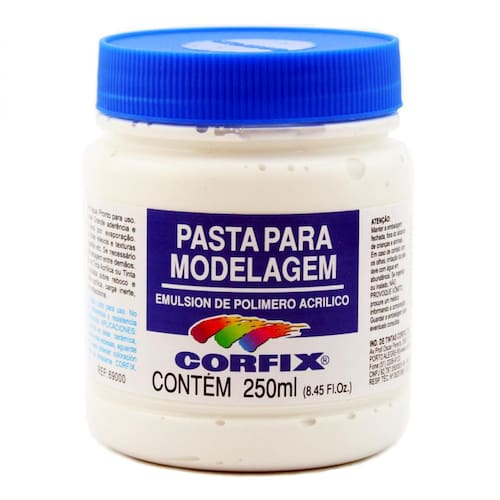 Pasta Para Modelagem Corfix 250Ml Produto ideal para criação de relevos e texturas sobre telas, madeira, MDF, cerâmica, gesso e papelão. Pode ser pintada com tintas acrílicas ou óleo. Pronta para uso. Acabamento fosco. Secagem completa em 72 horas. Solúvel em água e não tóxica. O produto pode ser aplicado com pincel ou espátula. O tempo de secagem pode variar de acordo com a camada aplicada. Secagem completa em 72 horas. Pronta para uso. Acabamento fosco. Pode ser aplicada com pincel ou espátula.