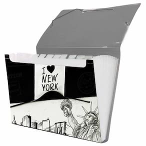 Produto: Pasta Sanfonada A4 Marca: Dello Modelo: Nova York Cor: Colorida estampa Nova York Material: Papelão e polipropileno Divisórias: 12 Dimensões: 331 x 32 x 244 mm Formato: A4