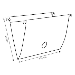 Pasta suspensa Kraft. Acompanha visor e etiqueta, grampo plástico e hastes metal fixas. Abas coladas; Possui posições para grampos e 2 posições para arquivo de saco plástico. Visor e etiquetas para identificação e visualização do conteúdo. Visualização frontal de documentos, através de furo central. Vinco marcador de páginas. Dobra pode ser usada como apoio de documentos.