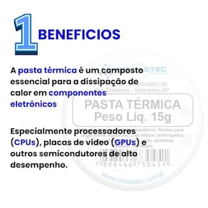A Pasta Térmica de Silicone Implastec 15g é a escolha ideal para profissionais e entusiastas que buscam desempenho térmico superior e proteção confiável para seus equipamentos eletrônicos.