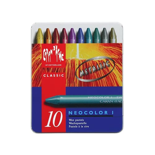 Pastel Oleoso Caran D'Ache Neocolor I Metálico Com 10 Cores O Estojo Pastel Oleoso Artístico Profissional Neocolor I Caran d'Ache contém 10 Pastéis com Cores Metálicas de excepcional qualidade sendo solúvel em terebintina. Pode ser aplicado em inúmeras superfícies como papel, plástico, tela de pintura, madeira, tecido, couro, pedra, vidro entre outras. É resistente à água e fácil de trabalhar, muito econômico graças ao excelente poder de cobertura e resistente a luz. Produto em conformidade com a ASTM D4236.