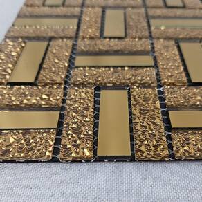 Transforme seus ambientes com esta pastilha decorativa feita de vidro verdadeiro, combinando brilho, textura e um visual moderno. O design em padrão geométrico cria um efeito visual sofisticado, com peças retangulares em tom dourado e detalhes texturizados que adicionam profundidade e requinte.