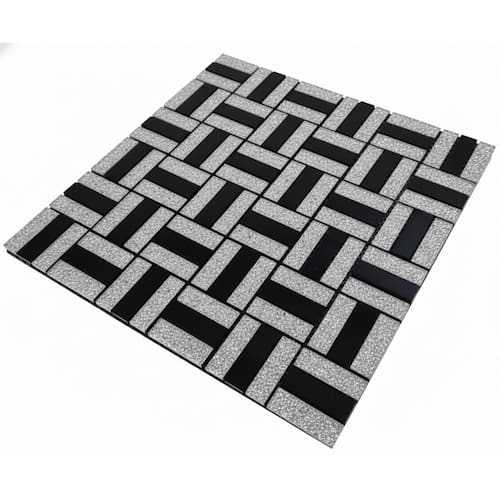 Transforme seus ambientes com esta pastilha decorativa feita de vidro verdadeiro, combinando brilho, textura e um visual moderno. O design em padrão geométrico cria um efeito visual sofisticado, com peças retangulares em tom prata e preto e detalhes texturizados que adicionam profundidade e requinte.