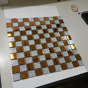 Transforme seus ambientes com esta pastilha decorativa feita de vidro verdadeiro, combinando brilho, textura e um visual moderno. O design em padrão geométrico cria um efeito visual sofisticado, com peças retangulares em tom dourado e detalhes texturizados que adicionam profundidade e requinte.