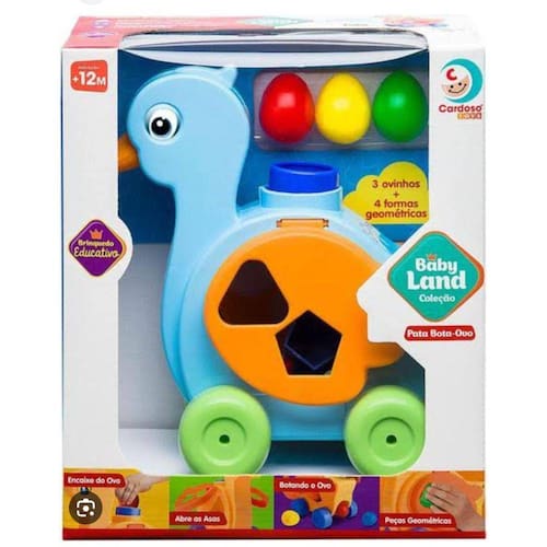 Para o brinquedo ficar mais interessante, possui rodas, contém 4 formas geométricas, abre as asas e ainda 3 ovinhos coloridos que é colocado pela parte superior do brinquedo e depois a pata bota o ovo!