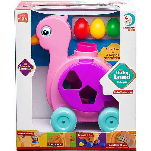 Para o brinquedo ficar mais interessante, possui rodas, contém 4 formas geométricas, abre as asas e ainda 3 ovinhos coloridos que é colocado pela parte superior do brinquedo e depois a pata bota o ovo!