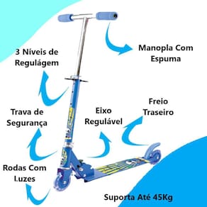 O patinete é resistente suportando até 45kg todo em metal, plástico e pvc tendo alta performance até para as aventuras mais radicais e exigentes, tem a segurança também pois possui 2 rodas garantindo estabilidade e ainda por cima é super pratico para levar a qualquer lugar pois é dobrável e ajustável podendo ser o companheiro da sua criança por muito tempo.