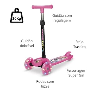 Patinete Com Luz Infantil Super Girl 3 Rodas Dobrável Menina