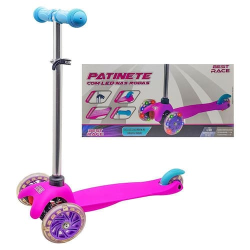 Patinete Infantil com regulagem de altura da barra de direção, guidão emborrachado e anatômico, e leds nas rodas que acendem quando o patinete está em movimento.