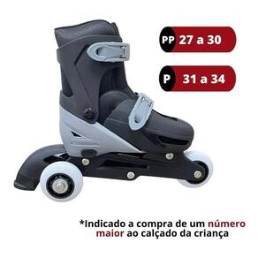 Ficha Técnica: • Bota ajustável • 2 EM 1 Pode ser inline e triline • Sistema de configuração fácil • 2 travas de segurança • Freio traseiro no pé direito • Rolamento de aço • Peso máximo: 50kg • Disponível nos tamanhos: PP (no 27 a 30) e P (no 31 a 34) • Selecionar o tamanho antes de finalizar a comprar