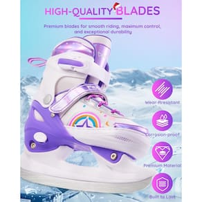 Patins de gelo para crianças, meninas, patins de gelo para crianças pequenas - Patins de gelo ajustáveis de 4 tamanhos para crianças: os patins de gelo Fitense para crianças oferecem 4 tamanhos ajustáveis para crescer com os pés do seu filho, garantindo que as crianças aproveitem esses patins de gelo por muitos anos. Basta pressionar o botão e estender o bico para alcançar um comprimento adequado do sapato. (Pequeno: 9C-12C, Médio: 12C-2Y, Grande: 3Y-6Y) - Estilo princesa sonhadora e pacote requintado: nossa caixa de presente de alta qualidade cuidadosamente trabalhada para patins de gelo infantis, com seu design elegante, a torna a escolha de presente perfeita para o Natal, aniversários e outras ocasiões especiais. Deixe as meninas entrarem em um mundo de sonhos repleto de estrelas e se tornarem uma princesa deslumbrante no gelo! - Lâminas de alta qualidade para patinação suave: estes patins de gelo para meninas apresentam lâminas premium projetadas para deslizamento suave, controle preciso e excelente durabilidade. Com propriedades resistentes ao desgaste e à corrosão, garantem desempenho a longo prazo e uma experiência excepcional de patinação no gelo. Perfeito para uso interno e externo - Forro quente e confortável: nossos patins de gelo para meninas apresentam um forro de tecido e acolchoamento confortável para garantir conforto e calor extra mesmo em climas frios. O forro espesso oferece maior conforto, estabilidade e absorção de choque, reduzindo a fadiga do pé durante a patinação. O revestimento externo robusto resiste à quebra e protege contra fragmentos de gelo, mantendo os pés secos e seguros contra respingos. - Proteção tripla de segurança e fácil armazenamento: nossos patins de gelo para meninas estão equipados com proteção tripla, incluindo fivelas, fechos de gancho e laço e cadarços para garantir que os pés do seu filho estejam presos com segurança enquanto patina. Além disso, uma bolsa de skate de alta qualidade está incluída para armazenamento conveniente e portabilidade, facilitando o transporte e o armazenamento dos patins. Desfrute de patinação sem complicações com tranquilidade!