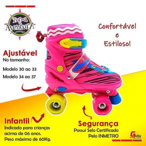 Especificações: - marca: unitoys - cor: rosa - tamanho: 30-33 e 34-37 ( selecionar o tamanho antes da compra ) - sistema de ajuste para se adequar ao tamanho. - rodas de 54mm e rolamento de aço. - certificado pelo inmetro - projetado com materiais de alta qualidade garantindo o conforto e agilidade necessária. - os patins também possuem cinto em tiras aderentes, sistema de amarração em cadarço e presilha reforçada para uma melhor estabilidade dos pés. - possui freio frontal para controle de velocidade, cano flexível