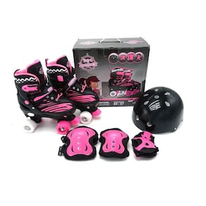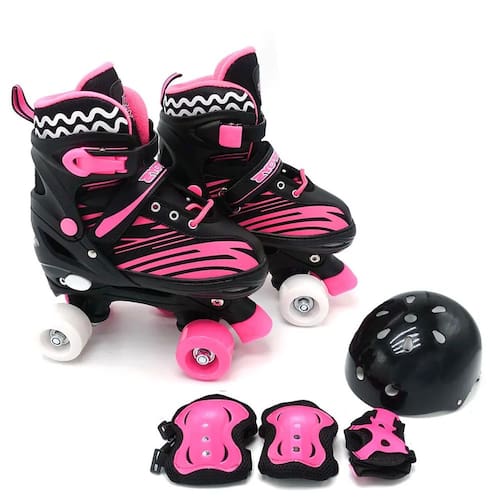 Contém - 1 Par de Patins com 4 Rodas , 1 Capacete, 2 luvas, 2 joelheiras, 2 Cotoveleiras
