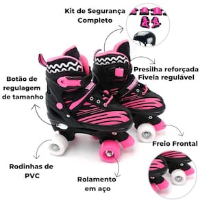 O Patins com 4 rodas auxilia no equilíbrio da criança eu seu primeiro contato com o esporte conta com o kit de proteção que protegera a criança ao aprender. Seu tamanho é ajustável para que a criança tenha e se divirta com o patins por um tempo maior, com cores vibrantes e super segura para garantir a máxima diversão da criança.