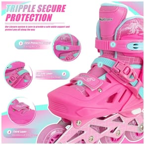 Proteção Tripla Segura: A fivela de catraca de segurança, a alça de força e o sistema de fechamento com cadarços ajudam a fixar os pés corretamente no skate, criando um efeito de envolvimento adicional ao usar nossos patins infantis em linha. Os freios atualizados equipados nos patins ajudam a frear quando necessário e também auxiliam na prevenção de colisões com outros patinadores.