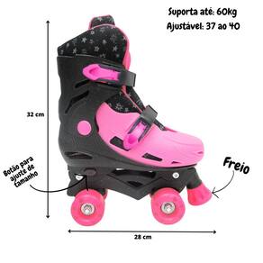 Informações técnicas: Dimensões: C 28 cm x A 32 cm x L 10 cm Composição: Plástico/Nylon/Polipropileno Peso Suportado: Até 60kg Ajustável: 37 ao 40 Tamanho: G Peso: 990 gramas (cada um) Quantidade de rodas: 04 rodas Modelo: Quad. Rodinhas em PVC: 54 mm Idade recomendada: Acima de 6 anos