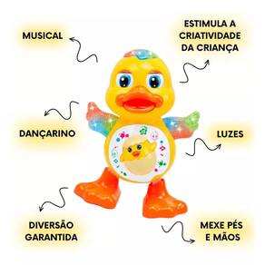 Diversão Garantida: O Pato Dançante encanta crianças de todas as idades com suas músicas alegres e danças contagiantes.Movimentos Animados: Com pés e mãos que se mexem, ele se movimenta ao ritmo da música, incentivando as crianças a se levantarem e dançarem junto!Estimula a Criatividade: Este brinquedo interativo promove a expressão criativa e o desenvolvimento motor, tornando a brincadeira ainda mais envolvente.Luzes Brilhantes: Equipado com luzes coloridas que piscam durante a dança, o Pato Dançante cria um ambiente festivo e divertido.Detalhes do Produto: