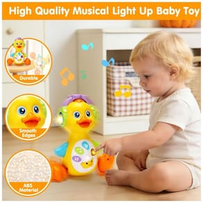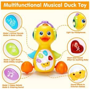 O Tsomtto Baby Musical Light Up Duck é um brinquedo educativo interativo em formato de pato, com luzes, músicas, sons e movimento para entreter bebês em momentos de tummy time, engatinhar e brincar sentados. O brinquedo possui 5 botões que reproduzem canções de ninar, melodias, risadas de bebê, sons de animais, músicas leves e efeitos engraçados, além de batidas de coração, enquanto o fone de ouvido do pato acende com luzes coloridas. O movimento de andar “rebolando”, combinado a luzes e som, incentiva o bebê a tocar, acompanhar com o olhar, engatinhar e perseguir o brinquedo.