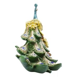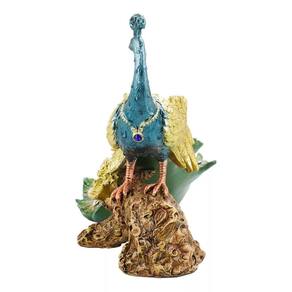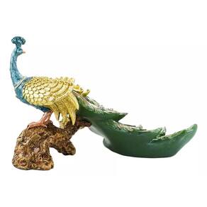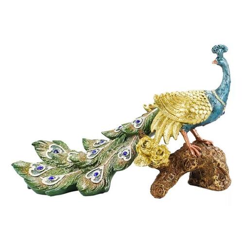 Enfeite decorativo no formato de um majestoso pavão de 33 cm de comprimento com a cauda longa verde em evidência e com asas cor dourada. Cores intensos rico em detalhes. Ideal para decoração de interiores. Material: resinaCódigo: LK23871L5-MPeso: 700gAltura: 20cmLargura: 15cmComprimento: 33cm
