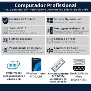 Pc completo intel i7 sexta geracao nvme 512 gb 16 gb ddr4 mon 20 w 11 Equipamentos prontos para usar no dia a dia, com peças de qualidade, sistema instalado e de quem sabe o que faz. Ideal para quem busca um computador ágil e confiável, essa máquina foi pensada para lidar com várias tarefas ao mesmo tempo, sem travamentos ou perda de desempenho. Nossos diferenciais: 2. Montagem nacional com padrão profissional Todos os nossos computadores são montados em ambiente industrial dentro do brasil, seguindo normas técnicas e rigoroso controle de qualidade. Isso garante um equipamento confiável, com suporte direto e entrega mais rápida. 3. Armazenamento m.2 nvme: velocidade de nova geração Este computador já vem com armazenamento no formato m.2 nvme, que é ainda mais rápido do que os ssds tradicionais. Essa tecnologia permite inicialização quase instantânea do sistema e abertura de programas em segundos, oferecendo uma experiência mais fluida e produtiva no uso diário. 4. Desempenho com processador intel Equipado com processador intel, reconhecido mundialmente por sua estabilidade e eficiência, esse computador oferece excelente desempenho para uso diário, multitarefas e aplicações profissionais. Você verá as especificações completas do processador mais abaixo na descrição. 5. Expansível e pronto para upgrades - sem perder a Quer adicionar uma placa de vídeo dedicada Ou instalar mais memória ou um novo hd Espaço interno e conexões disponíveis para você expandir quando quiser. Instale mais memória, hd ou placa de vídeo sem afetar a de fábrica. 6. de fábrica e suporte ao cliente Produto testado, revisado e enviado pronto para uso. Conta com completa e suporte técnico direto com a gente. . Em caso de dúvidas, estamos prontos para atender você com agilidade e clareza, garantindo uma experiência pós-venda segura e confiável. Especificações técnicas: Processador Marca: intel Série: i7 6 geração Frequência base: 3.40 ghz Frequência turbo max: 4.00ghz Núcleos: 4 Threads: 8 Placa-mãe Modelo: h110 chipset intel Socket: lga 1151 - suporte para intel i3/i5/i7 6 e 7 geração Formato: micro atx Memória: 2 slots ddr4 - até 32gb Vídeo: hdmi + vga Slots de expansão: 1x pci express x16, 2x pci express x1 Armazenamento: 3x sata iii Usb traseiras: 2x usb 3.0 + 4x usb 2.0 Rede: gigabit lan 10/100/1000 Áudio: hd integrado line in/out + mic Outros: conectores frontais para usb, áudio e fan Memória ram Capacidade: 16gb ddr4 Armazenamento Tipo: m.2 Capacidade: 512gb Gabinete Placa mãe suportada: micro atx Conexões: 2x usb e 2x áudio Cor: preto Baias: não possui Fonte Voltagem: bivolt Potência: 230w Sistema operacional Windows 11 pro vitalício Acessórios Monitor Teclado Mouse Caixa de som Monitor Especificações -tamanho da tela: 20 -formato de tela: 16:9 widescreen -resolução : 1600900 , hd+ 75hz -brilho: 300 cd/m2 -contraste: 1000:1 tipico -tempo de resposta: 5ms -suporte de cores: 16 milhões de cores - controle de ajuste digital -entrada: hdmi, vga -acompanha cabo hdmi -bivol -cor: preto -montagem da parede vesa: sim 12 meses Observações: - as imagens são meramente ilustrativas. - mudanças podem ocorrer no design do produto de acordo com o nosso momentâneo.