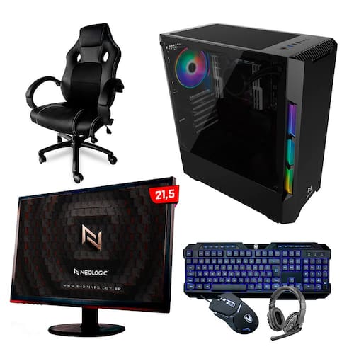 Conteúdo da Embalagem: 1 Computador Neologic Gamer, 1 Monitor 21,5', 1 Headset Gamer, 1 Mouse Gamer, 1 Teclado Gamer, 1 Cadeira Gamer.