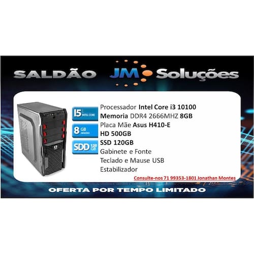 O Computador JM Soluções I310100, vem equipado com processador Intel Core i3-10100 de 10ª Geração com 4 Núcleos e 8 Threads de 3.60Ghz a 4.30Ghz no modo Turbo, Placa Mãe H410M, 8GB de Memoria RAM DDR4 2666 Mhz (1x8GB), SSD de 240GB Sata 3 2.5" e Sistema Operacional Windows 10 home (licença digital).
