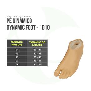 Descrição Comercial: O 1D10 Dynamic Foot apresenta forma natural com superfície lisa, dedos em forma e sandália. As características funcionais são alcançadas através da combinação comprovada de um núcleo com contornos e espuma funcional. Isso resulta em uma batida confortável no calcanhar e em uma capotagem mais suave do que com o pé SACH. A sofisticada tecnologia de espuma oferece características dinâmicas aprimoradas do antepé. O 1D10 está disponível com ou sem um adaptador modular de titânio montado.