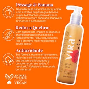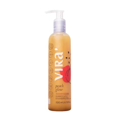 Shampoo com pH 5.0 que limpa sem ressecar, preservando o manto lipídico dos fios.Fórmula hidronutritiva com agentes de limpeza e condicionantes equilibrados.Nutre, fortalece e restaura a flexibilidade dos cabelos secos desde a primeira aplicação.Reduz o frizz, protege a cor e evita o ressecamento e o desbotamento em cabelos tingidos.Deixa os fios limpos, macios, suaves e prontos para absorver os ativos da Máscara Peach Glow.Ideal para manter os cabelos saudáveis, com brilho natural e aspecto revitalizado.Como usar: aplique nos fios molhados, massageie até formar espuma e enxágue. Repita se necessário.Dica: concentre a aplicação na raiz e utilize apenas o excesso de espuma nas pontas.Notas de fragrância: floral frutada com pêssego, frutas vermelhas, jasmim, maracujá, musk e baunilha. Marca: Virá Cosméticos