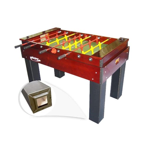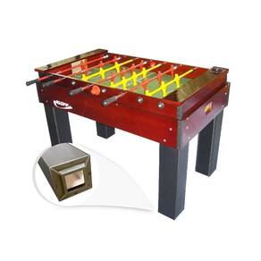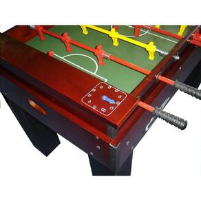 Mesa de pebolim nas medidas oficiais com estrutura da caixa produzida em madeira maciça pinus com acabamento em verniz tingido brilhante, bonecos em alumínio fundido com pintura epóxi e varões embutidos, goleiro com giro de 360º; contador de pontos e pés em MDP com sapata em polipropileno que evita a umidade nos pés.