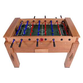 Mesa de pebolim nas medidas oficiais com estrutura em madeira maciça cedrinho em tom de mogno e com 04 pés, campo de jogo em 5mm de espessura na cor verde, bonecos em alumínio e ferros dos bonecos pintados em Epoxi.