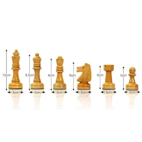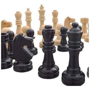 Conjunto completo contendo 32 peças, senfo 16 peças pretas e 16 peças brancas. As Peças brancas ficam na cor da madeira natural e as peças pretas são pintadas com uma tinta especial preta. Depois deste processo as peças recebem uma camada de verniz PU de Alto Brilho, que dão mais resistência e também deixam as peças com melhor apresentação. Este jogo vai embalado em uma caixa de papelão personalizada.
