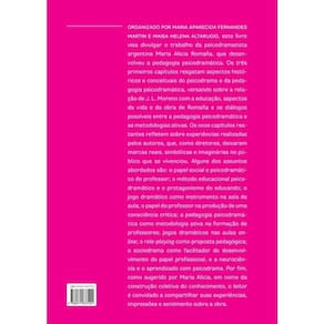 Organizado por Maria Aparecida Fernandes Martin e Maisa Helena Altarugio, este livro visa divulgar o trabalho da psicodramatista argentina Maria Alicia Romaña, que desenvolveu a pedagogia psicodramática. Os três primeiros capítulos resgatam aspectos históricos e conceituais do psicodrama e da pedagogia psicodramática, versando sobre a relação de J. L. Moreno com a educação, aspectos da vida e da obra de Romaña e os diálogos possíveis entre a pedagogia psicodramática e as metodologias ativas. Os onze capítulos restantes refletem sobre experiências realizadas pelos autores, que, como diretores, deixaram marcas reais, simbólicas e imaginárias no público que as vivenciou. Alguns dos assuntos abordados são: o papel social e psicodramático do professor; o método educacional psicodramático e o protagonismo do educando; o jogo dramático como instrumento na sala de aula; o papel do professor na produção de uma consciência crítica; a pedagogia psicodramática como metodologia ativa na formação de professores; jogos dramáticos nas aulas online; o role-playing como proposta pedagógica; o sociodrama como facilitador do desenvolvimento do papel profissional, e a neurociência e o aprendizado com psicodrama. Por fim, como sugerido por Maria Alicia, em nome da construção coletiva do conhecimento, o leitor é convidado a compartilhar suas experiências, impressões e sentimento sobre a obra. Textos de: Alcione Ribeiro Dias, Camila Tyrrell Tavares, Cristiane Tavares Romano, Cristina Jorge Dias, Elisabeth L. Bez Chleba, Gisele da Silva Baraldi, Julio Cesar Valentim, Lúcio G. Ferracini, Maisa Helena Altarugio, Maria Aparecida Fernandes Martin, Marly Unello Rosinha, Neide Feijó, Norival Albergaria Cepeda, Sara de Sousa e Sônia da Cunha Urt.
